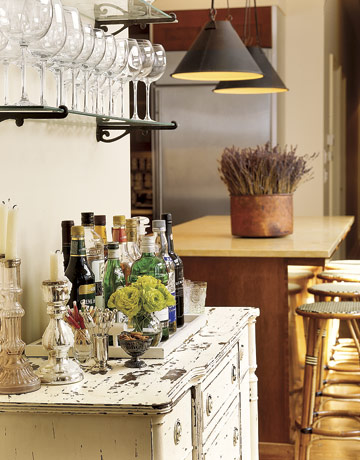 To create your own bar at home you will need the basics - stylish stemware and tumblers, a small flower arrangement, an ice bucket, essential bar tools, a pitcher of water, lemons and limes and basic mixers such as tonic water, cranberry juice, club soda, and Coke. For a simple bar start with vodka, rum, whiskey, wine, and beer. The experts say to plan on two drinks per person for the first two hours, one drink per person for each extra hour. Assume 40% drink beer, 30% use hard liquor, and 30% sip wine.